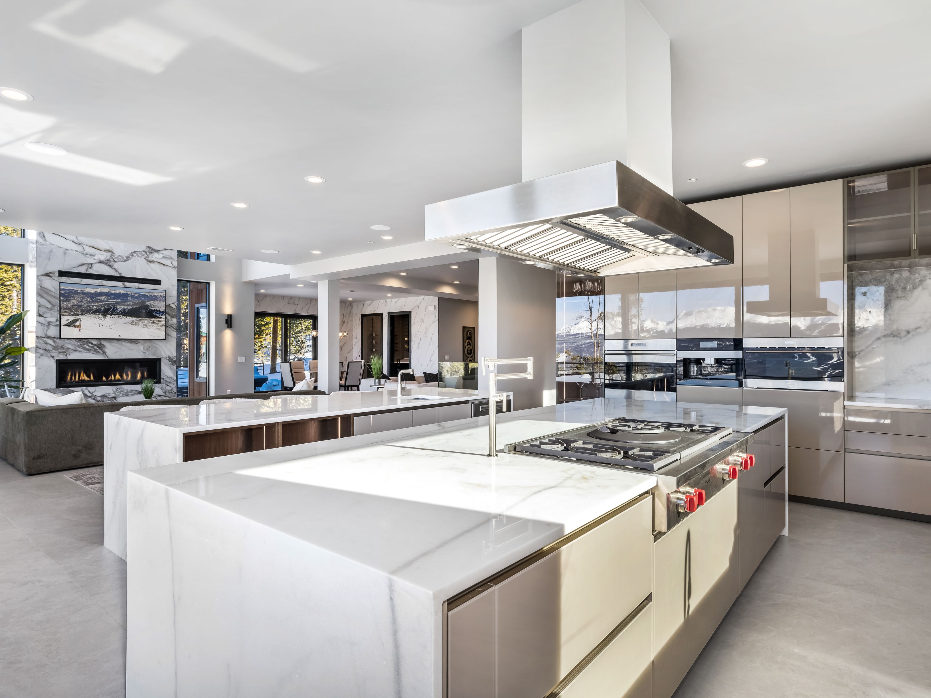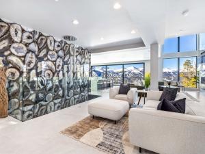 A 20-foot fireplace in the main living room is complemented by breathtaking views through the floor-to-ceiling sliding glass doors. Stepping outside, the oversized patio and alfresco kitchen are ideal for apres-ski entertaining or relaxing after a day of adventure on the slopes.