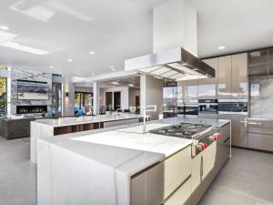 The two-level wall of agate connecting the first and second levels is a showstopping conversation piece. The second level has a spacious gourmet kitchen with Brazilian quartz countertops and Wolf range, double ovens, 30” SubZero refrigerator, freezer towers, and a Miele espresso system as well as a butler’s pantry, wine cellar, and wet bar.